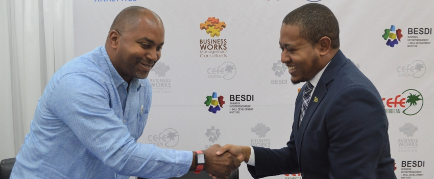 State Minister in the Ministry of Industry, Commerce, Agriculture and Fisheries (MICAF), Hon. Floyd Green (right), greets Member of Parliament for South Eastern St. Andrew, Julian Robinson, at the launch of Moody’s Small and Medium-sized Enterprises lending masterclass workshop, at the Ministry’s New Kingston offices, on Wednesday, January 15, 2020. MICAF’s MSME Division, in collaboration with Business Works Collective launched the programme to assist in the development of SMEs.