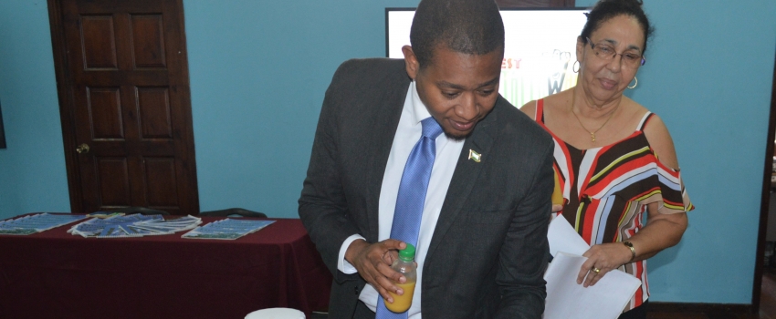 Minister of State in the Ministry of Industry, Commerce, Agriculture and Fisheries, Hon. Floyd Green (left), views breadfruit products being shown to him by Author Andrea Whyte, at her book launch Breadfruit Recipes: Sweet and Savoury at the Institute of Jamaica, East Street, downtown Kingston, on Monday, September 23, 2019. Isle Bites Limited in collaboration with the Institute of Jamaica hosted the launch. The aim of the book is to educate and motivate consumers, as well as elevate the use of breadfruit.