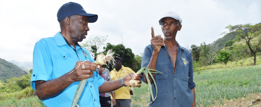 Hon J.C. Hutchinson (left), Minister without Portfolio in the Ministry of Industry, Commerce, Agriculture and Fisheries, discusses onion cultivation with farmer Dean Reid on his approximately 1-acre onion plot in Abbey, St. Thomas, on April 10. As part of its Import Substitution Programme, the Ministry is on a drive to increase onion production in Jamaica.