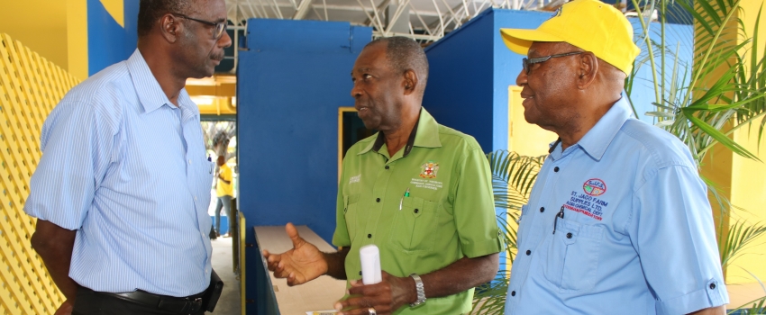 Hon. J.C. Hutchinson (centre), Minister without Portfolio in the Ministry of Industry, Commerce, Agriculture and Fisheries; in discussion with Emile Spence (left), president of the Colbeck Water Users Association in St. Catherine; at a seminar on irrigation held at Denbigh Showground in Clarendon on May 16. At right is O’Brien Johnson, Managing Director of St. Jago Farm & Hardware Supplies Ltd.