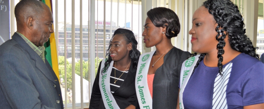 Minister without Portfolio in the Ministry of Industry, Commerce, Agriculture and Fisheries, Hon. J.C. Hutchinson (left), greets some of the contestants in the 2018 National Farm Queen competition during a courtesy call at the Ministry’s New Kingston offices, on Thursday, August 2. The 55th staging of the Farm Queen competition will be held at the Denbigh Agricultural, Industrial and Food Show in May Pen, Clarendon on Saturday, August 4, 2018.