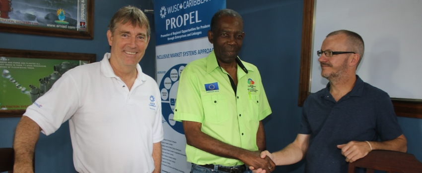 Hon J. C. Hutchinson (centre), Minister without Portfolio in the Ministry of Industry, Commerce, Agriculture and Fisheries, greets Tradd Cotter of Mushroom Mountain LLC/Source Farms at a National Mushroom Stakeholders’ Forum organised by PROPEL at Kendal in Manchester on May 25. At left is Doug Graham Project Director at PROPEL.