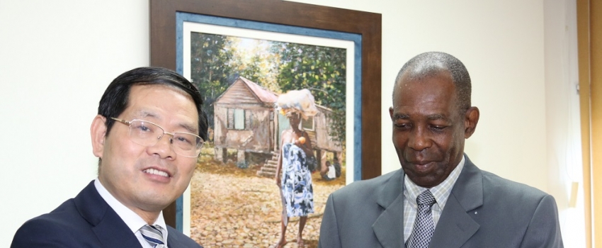 Hon J. C. Hutchinson (right), Minister without Portfolio in the Ministry of Industry, Commerce, Agriculture and Fisheries, views token received from Prof. Lu Wenming, Deputy Director General, International Bamboo and Rattan Organisation (INBAR), during a courtesy call at his Hope Gardens offices in St. Andrew on Monday, November 26. Prof Lu Wenming is visiting Jamaica to attend a three-day Caribbean International Bamboo Symposium to be held at the Jamaica Conference Centre in Kingston starting November 27 and culminating with a tour of bamboo facilities by delegates on Thursday, November 29.