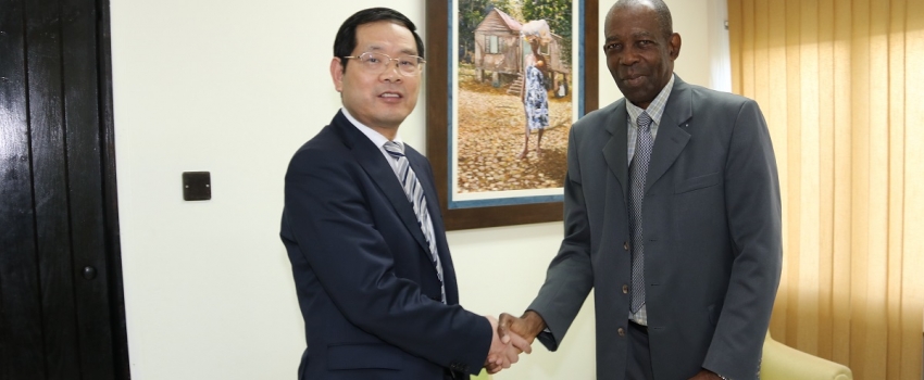Hon J.C. Hutchinson (right), Minister without Portfolio in the Ministry of Industry, Commerce, Agriculture and Fisheries, welcomes Prof. Lu Wenming, Deputy Director General, International Bamboo and Rattan Organisation, to Jamaica during a courtesy call at his Hope Gardens offices in St. Andrew on Monday, November 26. Prof Lu Wenming is visiting Jamaica to attend a three-day Caribbean International Bamboo Symposium to be held at the Jamaica Conference Centre in Kingston starting November 27 and culminating with a tour of bamboo facilities by delegates on Thursday, November 29.