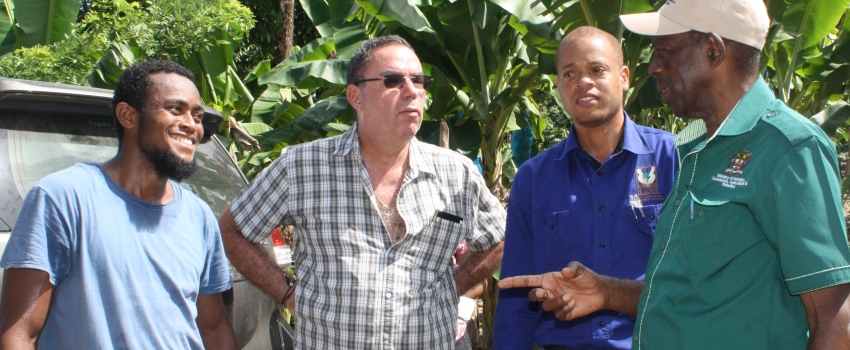 Minister without Portfolio in the Ministry of Industry, Commerce, Agriculture and Fisheries, Hon. J.C. Hutchinson (right), engages farmer, Richard Robinson (left), in discussion at his farm in Orange Bay, Portland on November 8. Others from second left are Member of Parliament for Western Portland, Hon. Daryl Vaz and Rural Agricultural Development Authority (RADA), Parish Manager for Portland Kasif Smith. Mr. Hutchinson toured several communities in Portland where the Ministry’s Production Incentive Programme is underway to increase domestic production of a number of crops.