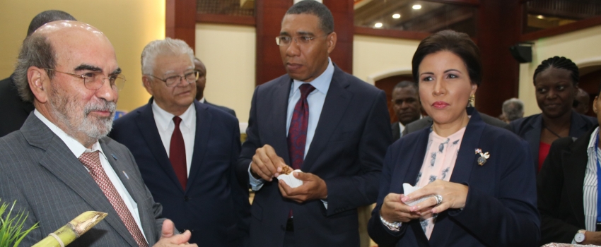 The Most Hon. Andrew Holness (2nd right), Prime Minister of Jamaica, and Dr. Margarita Cedeño, Constitutional Vice-President of the Dominican Republic Special Ambassador of the Food & Agriculture Organization (FAO), sample pastry during a tour of the exhibition at the Opening Ceremony of the 35th Session of the FAO Regional Conference for Latin America and the Caribbean held at the Montego Bay Convention Centre in Rose Hall, St. James, on Wednesday, March 7, 2018. Others from left are Dr José Graziano da Silva, Director General, FAO, and Hon Karl Samuda, Minister of Industry, Commerce, Agriculture and Fisheries.