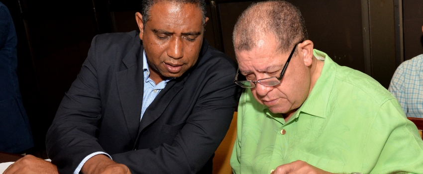 Minister of Industry, Commerce, Agriculture and Fisheries, Hon Audley Shaw (right) and Chairman, Coconut Industry Board (CIB), Christopher Gentles (left), peruse documents during the CIB’s Annual General meeting held at the Jamaica Conference Centre, downtown Kingston on May 4.
