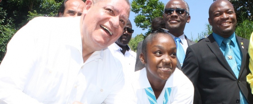 Industry, Commerce, Agriculture and Fisheries Minister, Hon. Audley Shaw (left), assists Vanessa Plummer to plant a lychee tree at the Christiana High School in Manchester on October 11, at the World Food Day National Ceremony and Exhibition. At right is Principal of Christiana High School, Leecent Wallace.