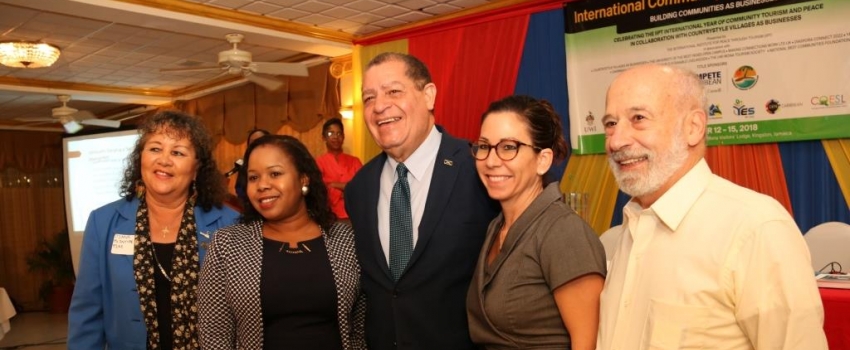 Hon Audley Shaw (centre), Minister of Industry, Commerce, Agriculture and Fisheries, along with (from left) Diana McIntyre-Pike, President/Founder Countrystyle Villages as Businesses and IIPT Caribbean President; Amanda Charles, Sustainable Tourism Specialist, Caribbean Tourism Organization; Annie Bertrand, Coordinator Productivity and Innovation in the Private Sector, Compete Caribbean; and Dr. Louis D’Amore, International Institute for Peace through Tourism Founder, at International Community Tourism Conference on November 13 at the University of the West Indies in St. St. Andrew. Minister Shaw encouraged the participants, representing Jamaican and Caribbean community tourism groups, not to see Airbnb as a competitor to community tourism but rather embrace it and use it as a platform to reach the world.