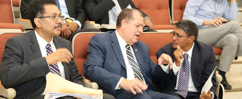 Hon. Audley Shaw (centre), Minister of Industry, Commerce, Agriculture and Fisheries (MICAF), converses with Reginald Budhan, Chairman of MICAF’s Tree Crop Project Management Committee, at the World Food Day Conference & Exhibition hosted by the University of Technology in Papine, St. Andrew, on October 16, 2018, which was held in collaboration with the Ministry, and the Food and Agriculture Organization of the United Nations. At left is UTech President, Professor Stephen Vasciannie. World Food Day was celebrated under the theme ‘Our Actions are our Future: A ZeroHunger world by 2030 is possible’.