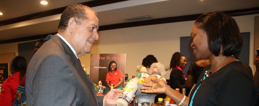 Minister of Industry, Commerce, Agriculture and Fisheries, the Hon Audley Shaw, converses with Trecia Campbell, Managing Director of Tricam Processors at the launch of the 2nd edition of True Stories: From Farm to Fork, a publication chronicling the journey of 29 small manufacturers and enterprises in the agri-based sector, held at the Jamaica Pegasus in Kingston on May 15.