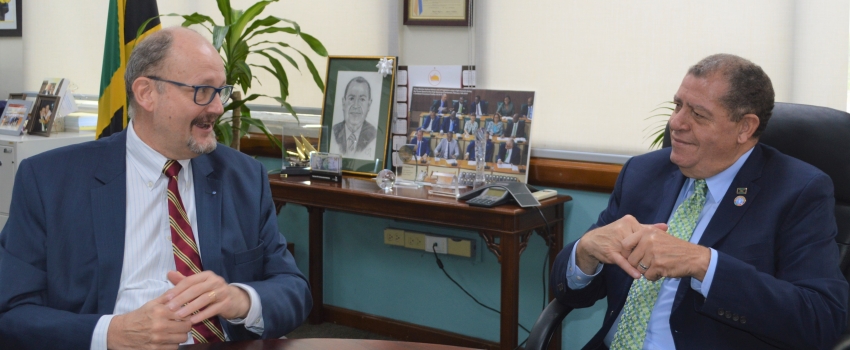 Minister of Industry, Commerce, Agriculture and Fisheries, Hon. Audley Shaw (left), in dialogue with Executive Director, International Cocoa Organization, Michel Arrion, during a meeting at the Ministry’s New Kingston offices on Thursday, June 27, 2019. Matters discussed at the meeting included the Frosty Pod Rot disease and preservation of the trees.