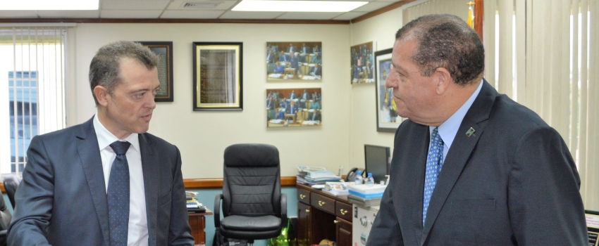 Minister of Industry, Commerce, Agriculture and Fisheries, Hon. Audley Shaw (right), in dialogue with outgoing Head of Regional Office for the Caribbean, European Investment Bank, René Pérez, during a courtesy call at the Ministry’s New Kingston offices, on Friday, February 8, 2019. Among the matters discussed were to explore greater levels of cooperation for the agricultural sector and a tighter relationship with the European Union in grant funding and loans.