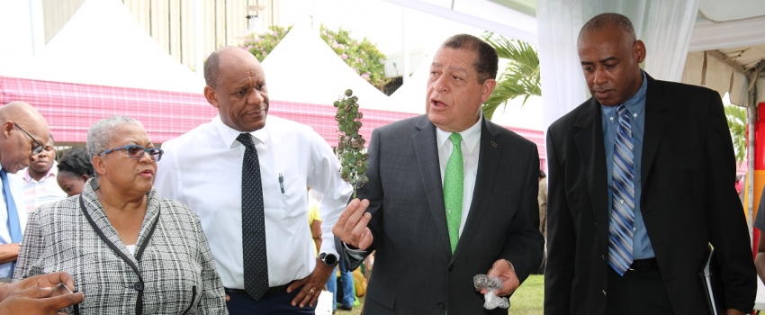 Hon Audley Shaw (2nd right), Minister of Industry, Commerce, Agriculture and Fisheries, discusses castor bean with (from left) Marlene Street-Forrest, Managing Director at the Jamaica Stock Exchange (JSE), Ian McNaughton, chairman, JSE, and Michael Pryce, Acting Chief Executive Officer at the Agro-Invest Corporation (AIC), during a tour of the AIC’s booth at the JSE’s Market Meets the Market by the Sea at the waterfront in downtown Kingston on February 7, 2019, one of the events marking the 50th Anniversary of the JSE.