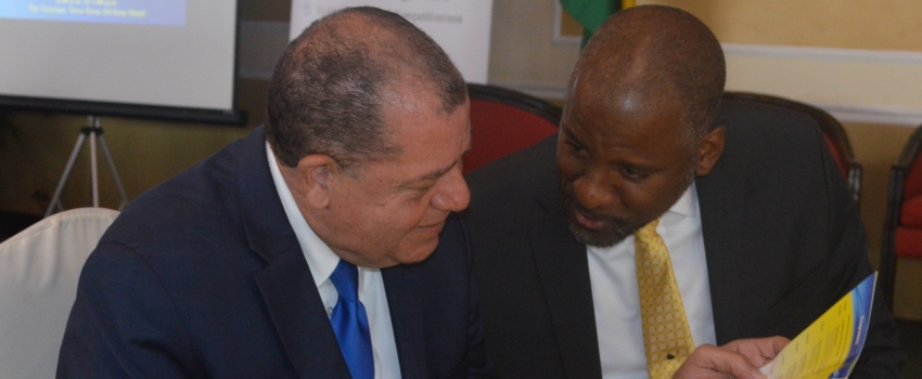 Minister of Industry, Commerce, Agriculture and Fisheries, Hon. Audley Shaw (left), converses with Director General, Planning Institute of Jamaica, Wayne Henry, at the Planning Institute of Jamaica’s ((PIOJ) Inaugural Economic Growth Forum at the Terra Nova All-Suites Hotel, on Thursday, March 14, 2019. The PIOJ Growth Inducement Programme hosted its Forum under the theme ‘From Elusive to Inclusive Growth’.