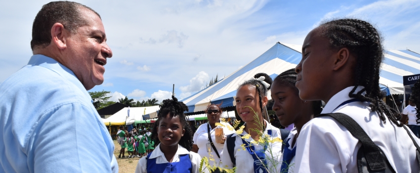Hon. Audley Shaw, Minister of Industry, Commerce, Agriculture and Fisheries; greets 4-H clubbites from the Collington Primary School at the Jamaica 4-H Clubs National Achievement Expo, held at Denbigh in Clarendon on April 27.