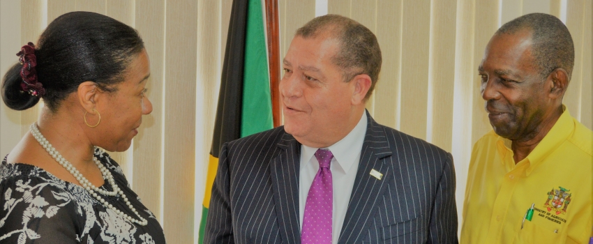Minister of Industry, Commerce, Agriculture and Fisheries (MICAF), Hon. Audley Shaw (centre), greets Ambassador of the Republic of Cuba, Inés Fors Fernández, during a courtesy call at the Ministry’s New Kingston offices on Monday, April 16, 2018. At right is Minister without Portfolio at MICAF, Hon. J.C. Hutchinson. The visit comes against the background of an inward mission organized by JAMPRO, to facilitate investment between Cuba and Jamaica. JAMPRO has been undertaking various activities in recent years under its Cuba Market Development Programme with the view of generating US$20M by 2020 through inroads in the Cuban hospitality sector.
