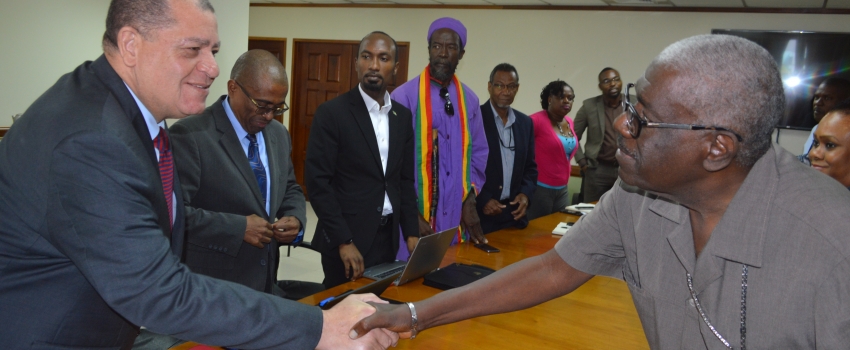 Minister of Industry, Commerce, Agriculture and Fisheries, Hon. Audley Shaw (left), greets Co-Chairperson of the Bahamas National Commission on Marijuana, Bishop Simeon Hall and team, during a courtesy call at the Ministry’s New Kingston offices on Thursday, October 10, 2019. The team met with the minister to garner information on Jamaica’s cannabis industry.