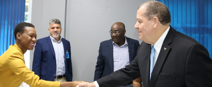 Industry, Commerce, Agriculture and Fisheries Minister, Hon. Audley Shaw (right), greets Director of the National Export-Import Bank of Jamaica, Lacey-Ann Bartley at a strategic planning workshop at the Bank on Hope Road on September 9. Others from (second left) are: Directors Geoffrey Ziadie and Norman Reid. The workshop was held under the theme, “The New EXIM: Innovative, Inclusive, Impactful”.