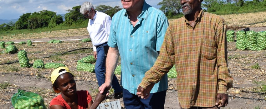 Hon. Audley Shaw (left), Minister of Industry, Commerce, Agriculture and Fisheries, greets employees of Caribbean Broilers’ Imagination Farm, Margaret Harrison and Desmond Clarke, during a tour of its onion plot in Hill Run, St. Catherine, on April 6. Under phase one of the project, some 12 acres of onion was being reaped.