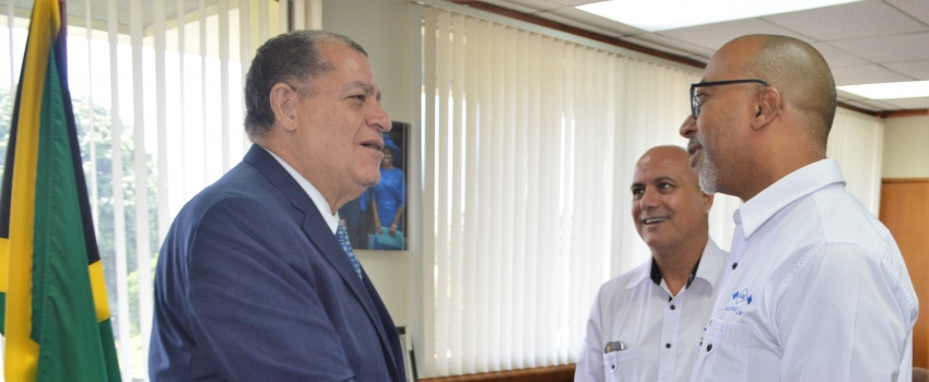 Minister of Industry, Commerce, Agriculture and Fisheries, Hon. Audley Shaw (left), greets General Manager, AG-Chem Plant Limited, Graham Dunkley (right), during a meeting at the Ministry’s New Kingston offices, on Wednesday, May 9, 2018. Discussions during the meeting included the expansion of factory space, the Irish Potato Programme, the export potential of products, and greater involvement of the company in the agricultural sector. Looking on is Chairman, AG-Chem Plant Limited, Joe Pires.