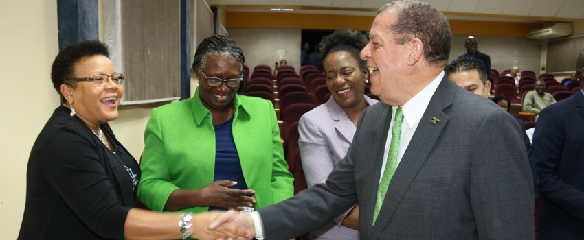 Hon Audley Shaw (right), Minister of Industry, Commerce, Agriculture and Fisheries, greets Dr. Elizabeth Johnson, Country Representative at the Inter-American Institute for Cooperation on Agriculture, at the launch of the MSc in Integrated Rural Development programme at the University of Technology, Jamaica on February 7, 2019 in St. Andrew. Others from left are Claire Bernard, Deputy Director General , Planning Institute of Jamaica, and Julia Bonner Douett, director of the Standards Division at the Bureau of Standards Jamaica. The MIRD programme is the first of its kind to be established in the English-speaking Caribbean.