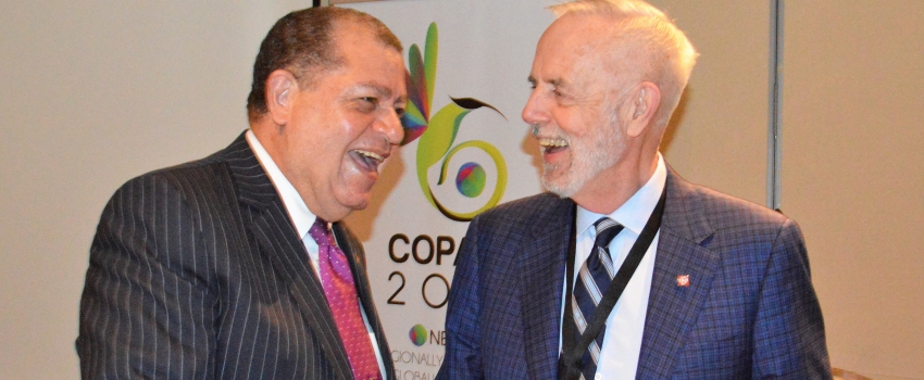 Minister of Industry, Commerce, Agriculture and Fisheries, Hon. Audley Shaw (left), greets President, International Organization for Standardization (ISO), John Walters, at the 2018 Pan American Standards Commission (COPANT) General Assembly in Jamaica, at the Hilton Rose Hall Resort, Montego Bay, on Monday, April 16.