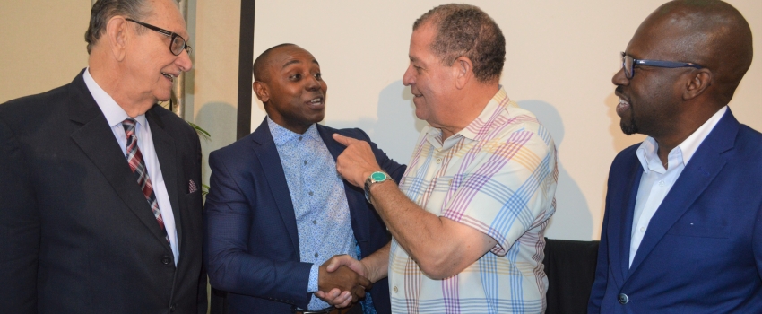 Minister of Industry, Commerce, Agriculture and Fisheries, Hon. Audley Shaw (2nd right), greets President and Founder, Professional Sales Representatives Association of Jamaica (PSRAJ), Duane Lue Fung (2nd left). Looking on (from left) are PSRAJ Patron, Hon. Danvers Williams; and Vice-President and Director, PSRAJ, Paul Bryan, at the inaugural launch of the PRSAJ, at the Spanish Court Hotel on Wednesday, June 5, 2019. The PSRAJ is a member-based organisation formed to elevate and accelerate the standards in the sales industry and the success of sales organizations and professionals in Jamaica and the region.