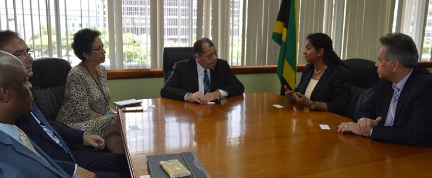 Minister of Industry, Commerce, Agriculture and Fisheries (MICAF), Hon. Audley Shaw (4th left), in discussion with (from left) Project Manager, United Nations Conference on Trade and Development (UNCTAD), Owen Holder; Chief of the ASYCUDA Programme, UNCTAD, Fabrice Millet; Chief Technical Director, MICAF, Andrene Collings; Director of UNCTAD's Division on Technology & Logistics, Shamika Sirimanne; and Regional Advisor, UNCTAD, Jamie Mendoza, at a meeting at the Ministry’s New Kingston offices, on Wednesday, June 20, 2018. The meeting was to update Minister Shaw on the Automated System for Customs Data (ASYCUDA) Programme in Jamaica.