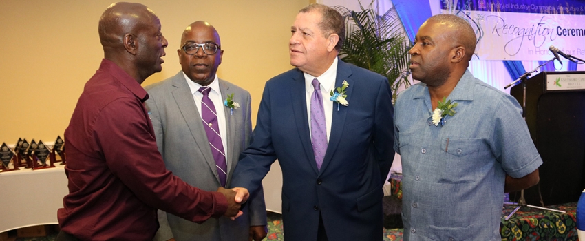 Hon Minister Audley Shaw (3rd left) of the Ministry of Industry, Commerce, Agriculture and Fisheries (MICAF), welcomes Clovis Bryan (left) retiree who served in the Ministry for 40 years to the Recognition Ceremony for Retirees held at the Knutsford Court Hotel on Thursday, March 28, 2019. Joining in the welcome are guest speaker , Wayne Jones of the Ministry of Finance and the Public Service (3nd left) and Acting Permanent Secretary , MICAF , Mr Dermon Spence (right).