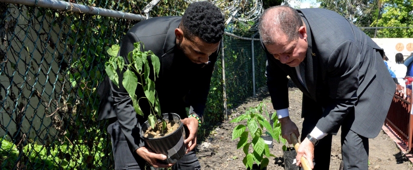 Industry, Commerce, Agriculture and Fisheries Minister, Hon. Audley Shaw (right), prepares the soil for the planting of a sweet pepper tree at the official launch of Mission:FoodPossible, at the St. John’s Primary School in St. Catherine, on Friday, February 1, 2019. At left is founder of the programme, Peter Ivey. Elements of the launch included a groundbreaking exercise for the school garden where students will be taught the importance of eating what they grow.