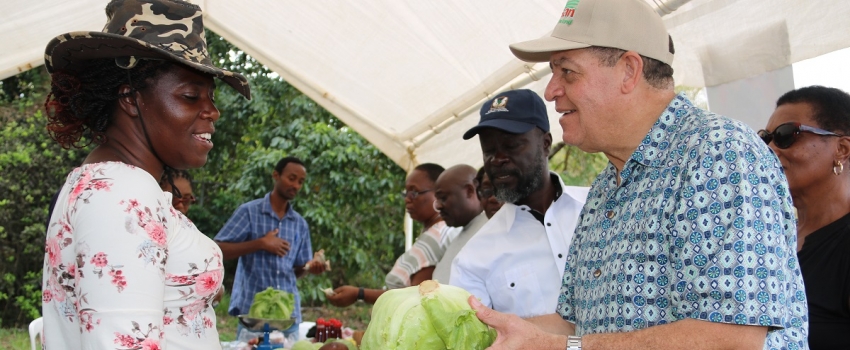 Hon Audley Shaw, Minister of Industry, Commerce, Agriculture and Fisheries, purchases lettuce from Casandra Hinds, farmer from Spice Grove in Manchester, at the Rural Agricultural Development Authority Manchester Open Day on March 22, 2019. The agriculture minister commended the Manchester farmers for being the highest domestic food crops producers in 2018 and encouraged them to plant even more crops while assuring them of Government’s commitment to provide the appropriate framework for the marketing of their produce.