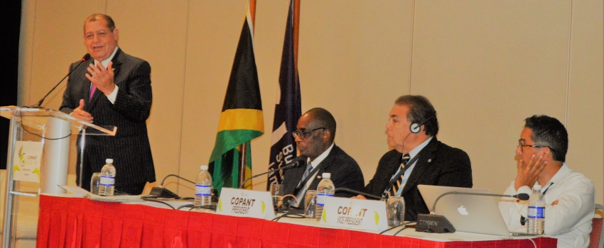 Minister of Industry, Commerce, Agriculture and Fisheries, Hon. Audley Shaw, speaking at the 2018 Pan American Standards Commission (COPANT) General Assembly in Jamaica, at the Hilton Rose Hall Resort, Montego Bay, on Monday, April 16. The Government of Jamaica through the Bureau of Standards Jamaica, in collaboration with COPANT, is hosting the 2018 Annual General Assembly during the period April 15-20.The Assembly is a forum where representatives from over 30 COPANT member countries and representatives from other standards and quality organizations from across the world are meeting to discuss strategies through which they can improve standards development. Seated (from left) are Executive Director, Bureau of Standards Jamaica, Stephen Wedderburn; President, Ricardo Fragaso and Vice-President, Jesús Lucatero, both of COPANT.