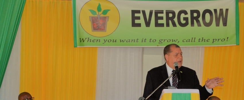 Minister of Industry, Commerce, Agriculture and Fisheries, Hon. Audley Shaw, speaking at the Evergrow Fertilizer Seminar, under the theme: Increased Crop Productivity through Proper Fertilizer Use, at the Caymanas Golf and Country Club, St. Catherine, on April 11, 2018. The aim of the seminar was to reinforce the importance of the effective use of fertilizers to increase crop production and productivity. Seated from left are Parish Manager, Clarendon Jamaica Agricultural Society, Charles Killingbeck; Chairman, Jamaica Organic Agriculture Movement Limited, Raymond Martin; and Director, Jamaica Floral Products Limited, Burrell Scarlett.