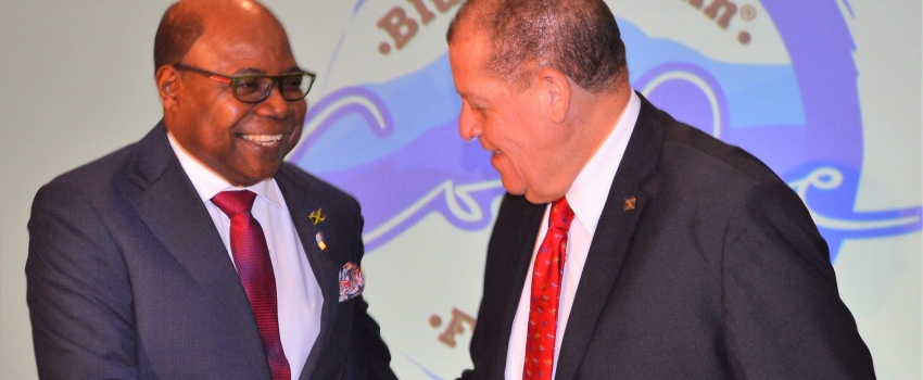 Minister of Industry, Commerce, Agriculture and Fisheries (MICAF), Hon. Audley Shaw (right), greets Minister of Tourism, Hon. Edmund Bartlett, at the launch of the Jamaica Blue Mountain Coffee Festival, at the Jamaica Pegasus hotel, on Tuesday, January 15, 2019. MICAF in collaboration with the Ministry of Tourism will host the Jamaica Blue Mountain Coffee Festival scheduled for March 1-3, 2019 at The Jamaica Defence Force training ground in the hills of Newcastle, St Andrew. The festival will celebrate, promote and market Jamaican culinary products and coffee.