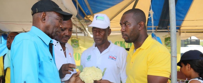 Hon J.C. Hutchinson (left), Minister without Portfolio in the Ministry of Industry, Commerce, Agriculture and Fisheries, discusses cauliflower cultivation with Clavia McFarlane (right), lecturer of Science and Agronomy at Knockalva Polytechnic College, during a tour of displays at the Montpelier Agricultural and Industrial Show in St. James on April 22, 2019. Others from left are Victor Wright, Deputy Opposition Spokesman on Agriculture, and Glendon Harris, President of the St. James Association of Branch Societies.