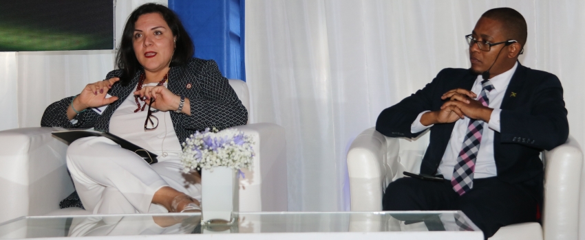 State Minister in the Industry, Commerce, Agriculture and Fisheries Ministry, Hon. Floyd Green (right) listens on as the Inter-American Development Bank, Chief of Operations in Jamaica, Adriana La Valley, speaks during a panel discussion hosted by the Private Sector Organization of Jamaica, at the Terra Nova All-Suite Hotel in St. Andrew on July 3.