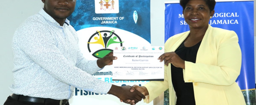 Senior Country Officer for the World Bank, Karlene Francis (right), presents certificate of completion to Keno Garvin (left) at the Agro-Meteorological Decision Support Services for the Fisheries Sector Training of Trainers Workshop Closing Ceremony at the Medallion Hall Hotel in St. Andrew on Friday, November 18, 2022.