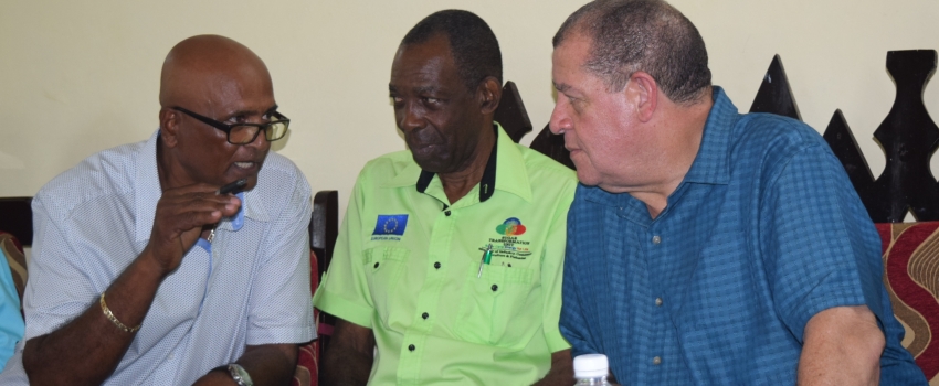 Ansel Golaub (left) of A&L Golaub & Sons marketing company speaking with (from left) the Hon J.C. Hutchinson, Minister without Portfolio, and Hon Audley Shaw, Minister of Industry, Commerce, Agriculture and Fisheries, both of the Ministry of Industry, Commerce, Agriculture and Fisheries, at the National Irish Potato Stakeholders’ Seminar at Devon, Manchester, on April 26.