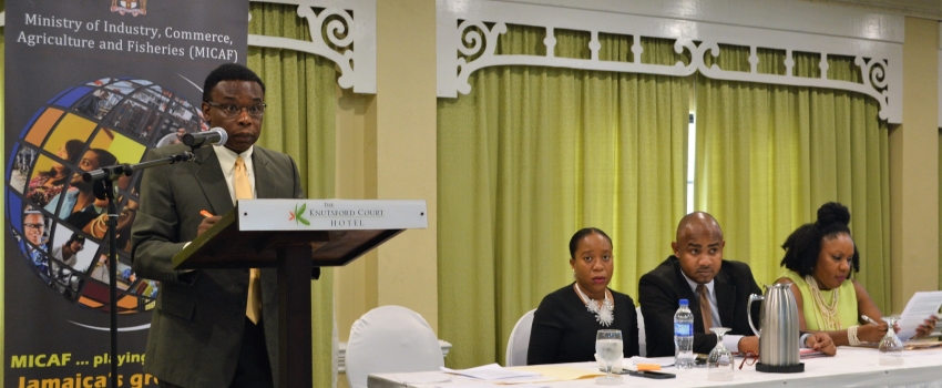 Principal Director, Medium, Small and Micro Enterprise (MSME) Division, Ministry of Industry, Commerce, Agriculture and Fisheries, Oral Shaw, addressing the quarterly meeting of the MSME Thematic Working Group, at The Knutsford Court Hotel, on Thursday, June 14, 2018. Matters discussed at the meeting included establishment of the National MSME Policy Implementation Committee, update on developments within the MSME landscape, and Member Entity Updates. Seated at the head table (from left) are Financing Specialist, MSME Division, MICAF, Karen Hylton; Director, Programmes and Projects, MICAF, Clifford Spencer; and Technical Specialist, Socio-Economic Development Community Renewal Programme, Planning Institute of Jamaica, Charmaine Brimm.