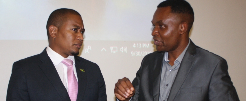 State Minister in the Ministry of Industry, Commerce, Agriculture and Fisheries, Hon. Floyd Green (left) listens attentively to a point made by Director of Harvard Global Health Catalyst, Professor Wilfred Ngwa, at a stakeholder engagement session, as part of the Harvard Phytomedicine and Medical Cannabis Institute’s (HPI) informational tour, at the Mona Campus of the University of the West Indies on September 30.