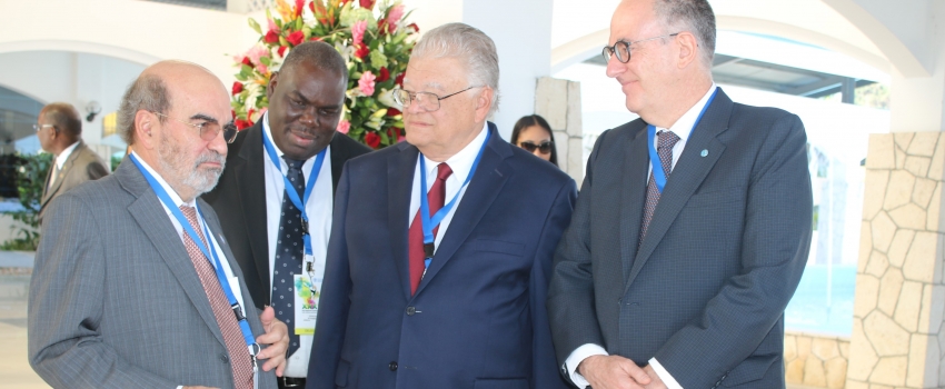 Dr José Graziano da Silva (left), Director General, Food & Agriculture Organization of the United Nations, in discussion with (from left) Permanent Secretary in the Ministry of Industry, Commerce, Agriculture and Fisheries, Donovan Stanberry, Hon Karl Samuda, Minister of Industry, Commerce, Agriculture and Fisheries, and Assistant Director General for FAO Latin America and Caribbean Region, Dr Julio Berdegué, at the Opening Ceremony of the 35th Session of the FAO Regional Conference for Latin America and the Caribbean, held at the Montego Bay Convention Centre in Rose Hall, St. James, on Wednesday, March 7, 2018.