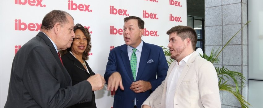Industry, Commerce, Agriculture and Fisheries Minister, Hon. Audley Shaw (left) listens to a point being made by Ibex Vice President of Operations, Jaime Vergara (right) at the opening ceremony of the third location of the business process outsourcing company, at the Courtleigh Auditorium on St. Lucia Avenue in New Kingston on September 4. Others from second left are Jamaica Promotions Corporation President, Diane Edwards and Ibex CEO, Bob Dechant. Ibex first opened in Portmore, St. Catherine in July 2016.