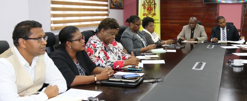 Permanent Secretary in the Ministry of Industry, Commerce, Agriculture and Fisheries (MICAF), Dermon Spence (left), addressing industry stakeholders at a COVID-19 consultation meeting on March 5, 2020, held at the Ministry’s Hope Gardens offices in St. Andrew. At right is the Hon. Floyd Green, Minister of State at MICAF. Issues discussed at the meeting, included the availability of supplies for manufacturers, the need to guard against hoarding and price increases as well as the need to ramp up production in relation to food security.