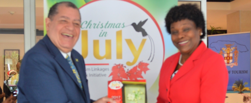Permanent Secretary in the Ministry of Tourism, Jennifer Griffith (right), presents Minister of Industry, Commerce, Agriculture and Fisheries, Hon. Audley Shaw, with a copy of the Christmas in July catalogue, at the Christmas in July Corporate Gifting event, at the Jamaica Pegasus hotel on Thursday, July 19. The Tourism Linkages Network of the Ministry of Tourism in partnership with the Jamaica Business Development Corporation, Jamaica Manufacturers and Exporters’ Association (JMEA), Jamaica Promotions Corporation and the Jamaica Hotel and Tourist Association hosted Christmas in July 2018, featuring an exhibition of locally produced corporate gifts and souvenir items. Some 115 exhibitors participated and showcased a variety of authentic Jamaican products.