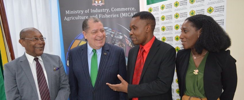 Industry, Commerce, Agriculture, and Fisheries Minister, Hon. Audley Shaw (second left) expresses delight at a point made by Director of Harvard Global Health Catalyst, Professor Wilfred Ngwa (second left), at a media briefing between the Ministry and Harvard International Phytomedicine and Medical Cannabis Institute (HIPI), at the Ministry’s New Kingston offices on October 1. Others from left are Chief Executive Officer of the Eden Gardens Group, Dr. Henry Lowe and Economic Growth Council Vice President, Dr. Sherene Smith.