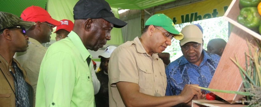 Most Hon. Andrew Holness (centre), Prime Minister of Jamaica, introduces sorrel to Uhuru Kenyatta (right), President of the Republic of Kenya, during a tour of the Ministry of Industry, Commerce, Agriculture and Fisheries (MICAF)Village at the 67th staging of Denbigh Agricultural, Industrial and Food Show on August 6. Looking on is the Hon. J.C. Hutchinson, Minister without Portfolio at MICAF.