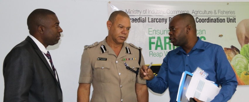 Shaun Baugh, Principal Director at the Ministry of Industry, Commerce, Agriculture and Fisheries(MICAF), in discussion with Deputy Commissioner of Police Clifford Blake(centre) and Deputy Superintendent of Police Samuel Blake at a Praedial Larceny Prevention Workshop at Medallion Hall in Kingston on December 12, 2018. The workshop, which was facilitated by the MICAF and the Jamaica Constabulary, was aimed at sensitising police officers from across the island on the impact of praedial larceny on the agricultural sector and the need for all officers to be engaged in the fight to reduce the incidences of praedial larceny.