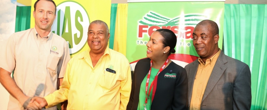 Lenworth Fulton (2nd left), President of the Jamaica Agricultural Society (JAS), welcomes Champion Farmer 2018 Martin Zsifkovics to the launch of National Farmers’ Month, held at the JAS headquarters in downtown Kingston on April 3, 2019. Others from left are Hedda Pitter, Business Development Manager, Newport-Fersan, and Peter Thompson, Chief Executive Officer, Rural Agricultural Development Authority. This year is the 36th anniversary of Farmers Month, held annually to celebrate the work of Jamaican farmers.
