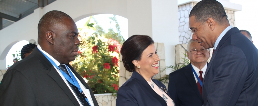 The Most Hon. Andrew Holness, Prime Minister of Jamaica, greets Dr. Margarita Cedeño, Constitutional Vice-President of the Dominican Republic and Special Ambassador of the Food & Agriculture Organization (FAO), at the Opening Ceremony of the 35th Session of the FAO Regional Conference for Latin America and the Caribbean held at the Montego Bay Convention Centre in Rose Hall, St. James, on Wednesday, March 7, 2018. Looking on are the Hon Karl Samuda (2nd right), Minister of Industry, Commerce, Agriculture and Fisheries, and Permanent Secretary Donovan Stanberry.